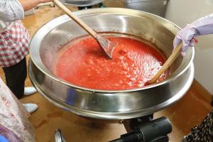 ケチャップを煮込んでいただき、瓶詰めしたケチャップを笑顔でお